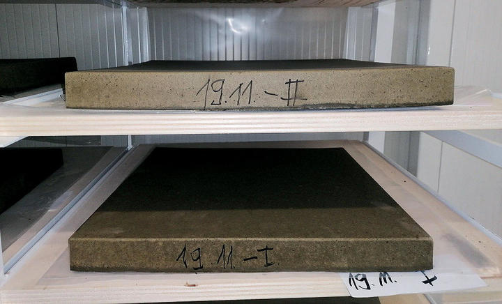 Plošče so se lahko razkalupile po enem dnevu, če je bila temperatura prostora med 20 in 24 °C. Ker se na laboratorijskem nivoju ne izdela večja količina velikih plošč naenkrat, tekom raziskav sinteze materiala odlagalne površine niso bile potrebne, medtem ko je pri prehodu na industrijski nivo odlaganje za daljšo nego in kasnejše shranjevanje ključnega pomena. Plošče so bile zato položene na za to namenjene police v skladiščne regale na podlago, ki se ne sprime s ploščo, saj je plošča še vedno rahlo lepljiva.