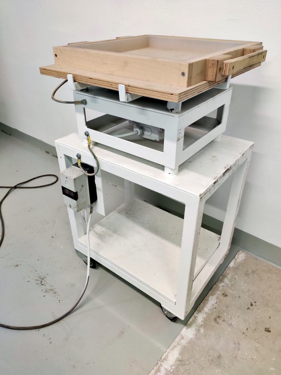 Pred začetkom pilotne proizvodnje je bilo potrebno opremiti prostor s kalupi, tehtnico, stresalno mizico in mešalom. Na podlagi izkušenj iz laboratorija so silikonski kalupi najprimernejši za vlivanje pripravljene mešanice, za lažje prenašanje pa so kalupi položeni na dodatne trdne nosilce, ki omogočajo, da se zmes po vlivanju ne deformira. Stresalna mizica, kamor se položi model s sveže pripravljeno mešanico, je namenjena enakomerni porazdelitvi vlite mase in izgonu mehurčkov, ki nastanejo tekom mešanja in vlivanja.